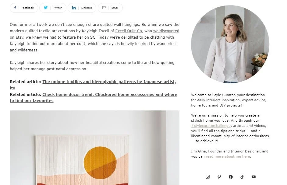 Excell Quilts has been featured in a variety of publications, from independent magazines to global lifestyle websites. If you would like to feature me or my work in your publication or website please get in touch by emailing kayleigh@excellquilts.com.